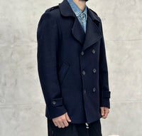 Modello doppiopetto in tessuto misto lana a lavorazione diagonale - Collo con revers dentellati - Chiusura con bottoni -Mostrine sulle spalle - Maniche lunghe con cinturino e bottone - Due tasche oblique frontali - Spacco centrale posteriore - Fodera e taschino interno con etichetta logo